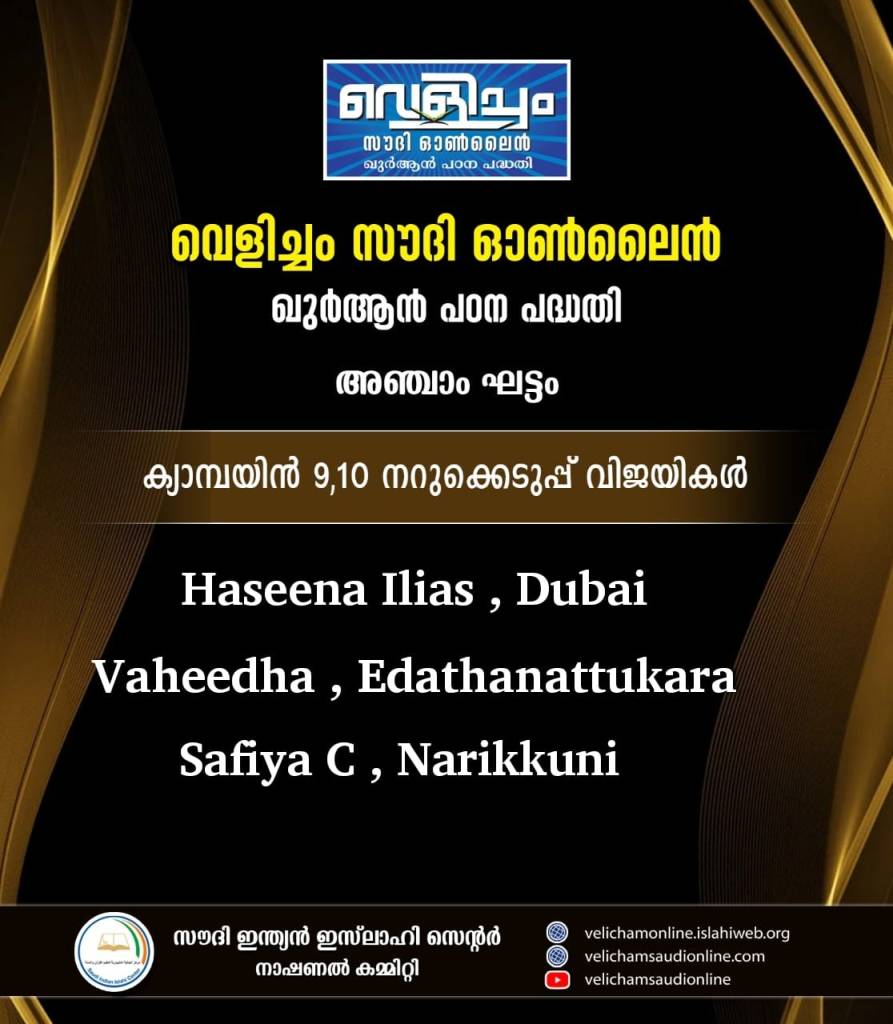 വെളിച്ചം സൗദി ഓൺലൈൻ അഞ്ചാം ഘട്ടം ക്യാമ്പയിൻ 07, 08 മത്സരങ്ങളിൽ മുഴുവൻ മാർക്കും കരസ്ഥമാക്കിയവരിൽ നിന്നുള്ള മൂന്ന് വിജയികൾ