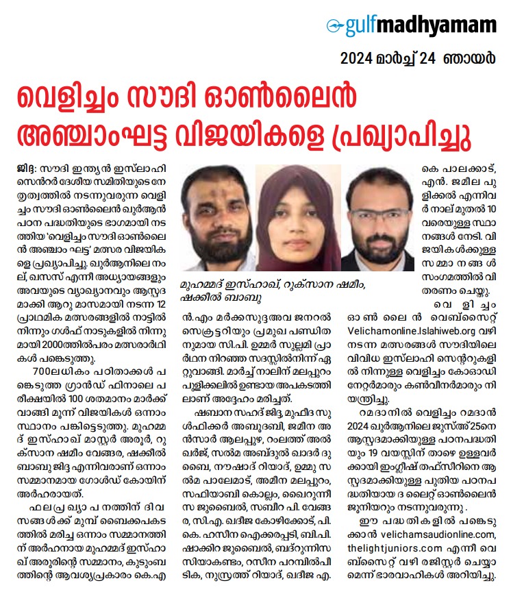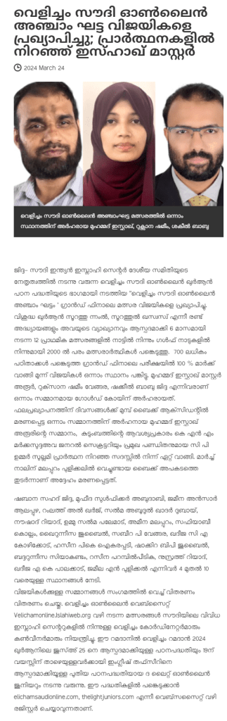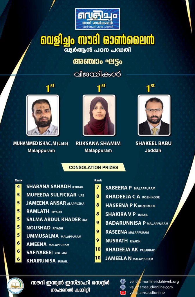 വെളിച്ചം സൗദി ഓൺലൈൻ അഞ്ചാം ഘട്ടം വിജയികൾ