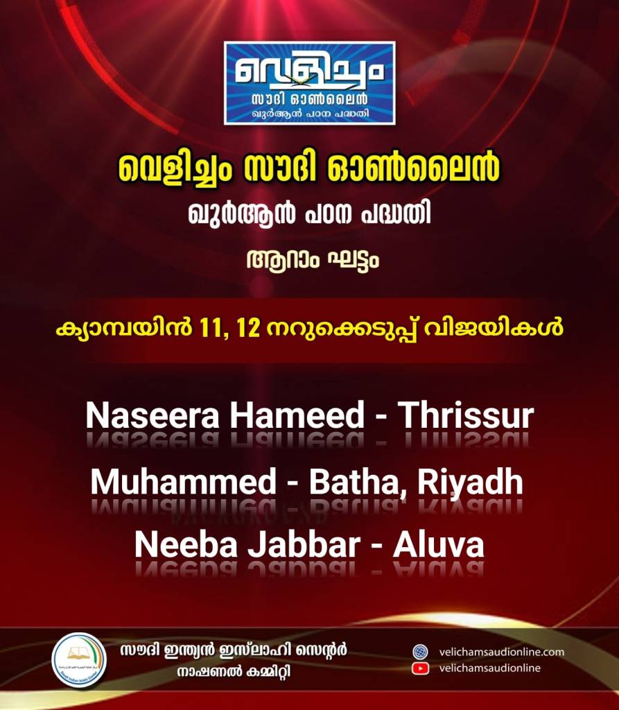 വെളിച്ചം സൗദി ഓൺലൈൻ അഞ്ചാം ഘട്ടം ക്യാമ്പയിൻ 11, 12 മത്സരങ്ങളിൽ മുഴുവൻ മാർക്കും കരസ്ഥമാക്കിയവരിൽ നിന്നുള്ള മൂന്ന് വിജയികൾ