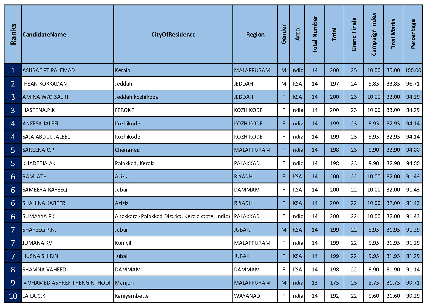 വെളിച്ചം സൗദി ഓൺലൈൻ മുന്നാം ഘട്ടം ആദ്യ 25 റാങ്കുകൾ
