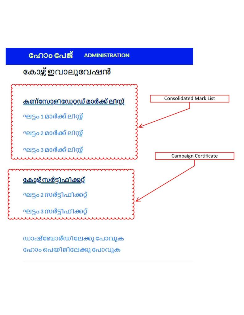 - ക്യാമ്പയിൻ ഫുൾ മാർക്ക്ഷീറ്റ് കിട്ടാൻ വേണ്ടി കണ്സോളിഡേറ്റഡ് മാർക്ക് ലിസ്റ്റ് എന്നതിൽ ക്ലിക് ചെയ്യുക.