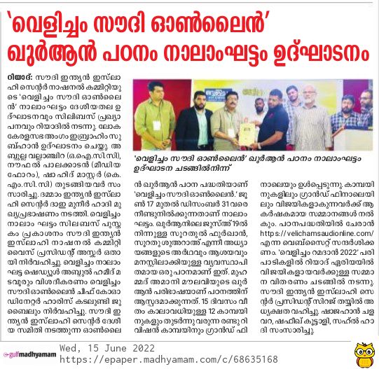 ദമാം ഇന്ത്യൻ ഇസ്ലാഹി സെൻ്റർ ദാഇ മുനീർ ഹാദി മുഖ്യപ്രഭാഷണം നടത്തി. വെളിച്ചം നാലാം ഘട്ടം സിലിബസ് പുസ്തകം പ്രകാശനം സൗദി ഇന്ത്യൻ ഇസ്ലാഹി നാഷണൽ കമിറ്റി വൈസ് പ്രസിഡൻ്റ് അസ്കർ ഒതായി നിർവഹിച്ചു. വെളിച്ചം നാലാം ഘട്ട ഷെഡ്യുൾ അബ്ദുൽ ഹമീദ് മടവൂറും വിശദീകരണം വെളിച്ചം സൗദി ഓൺലൈൻ ചീഫ് കോർഡിനേറ്റർ ഹാരിസ് കടലുണ്ടി ജുബൈലും നിർവ്വഹിച്ചു.