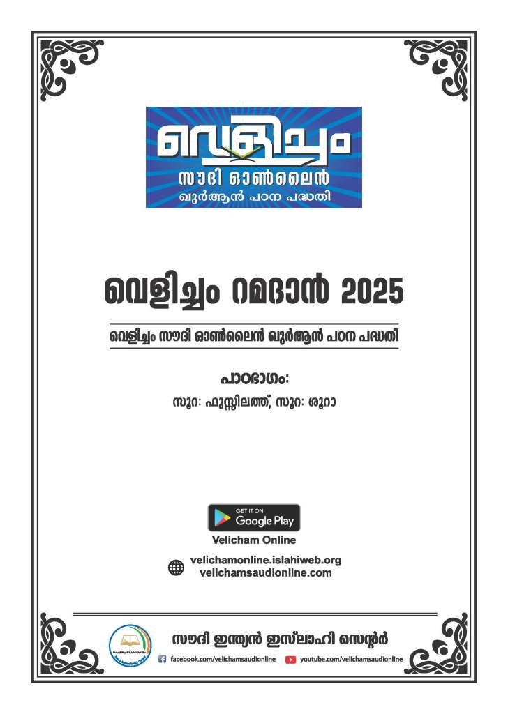 പരിശുദ്ധ ഖുർആനിന്റെ പഠനം ലളിതവും ജനകീയവുമാക്കുക എന്ന ലക്ഷ്യത്തോടുകൂടി സൗദി ഇന്ത്യൻ ഇസ്ലാഹീ സെന്റർ ദേശീയ സമിതി നടത്തിവരുന്ന ഓൺലൈൻ ഖുർആൻ പഠന പദ്ധതിയാണ് “വെളിച്ചം സൗദി ഓൺലൈൻ”. ഈ മഹത്തായ സംരംഭം വെളിച്ചം റമദാൻ 2025 എന്ന പുതിയ പഠനപദ്ധതി ഈ റമദാനിൽ ആരംഭിക്കുകായാണ്